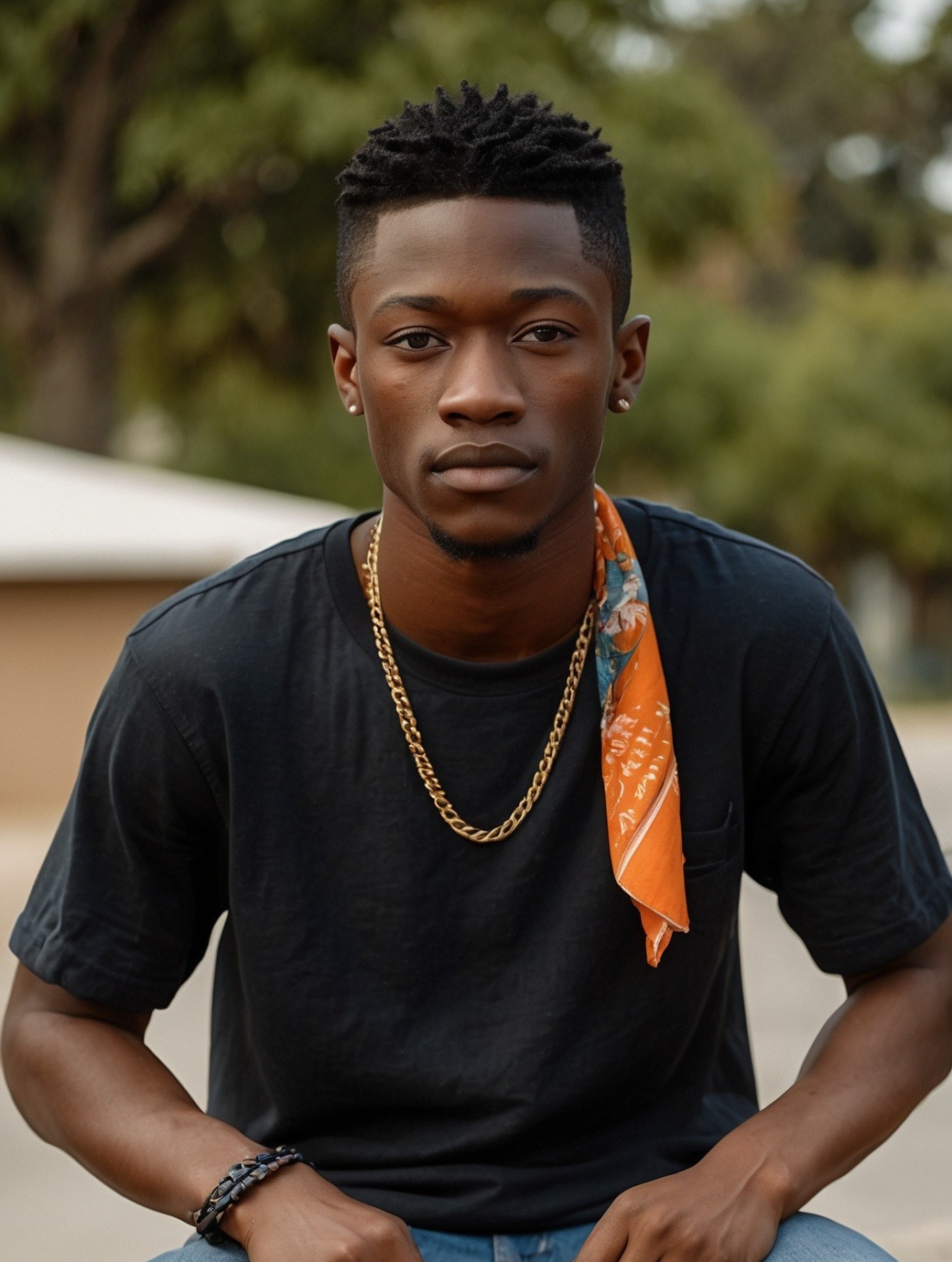 • Jewelry/Accessories: Gold chain necklace, gang-related bracelet.